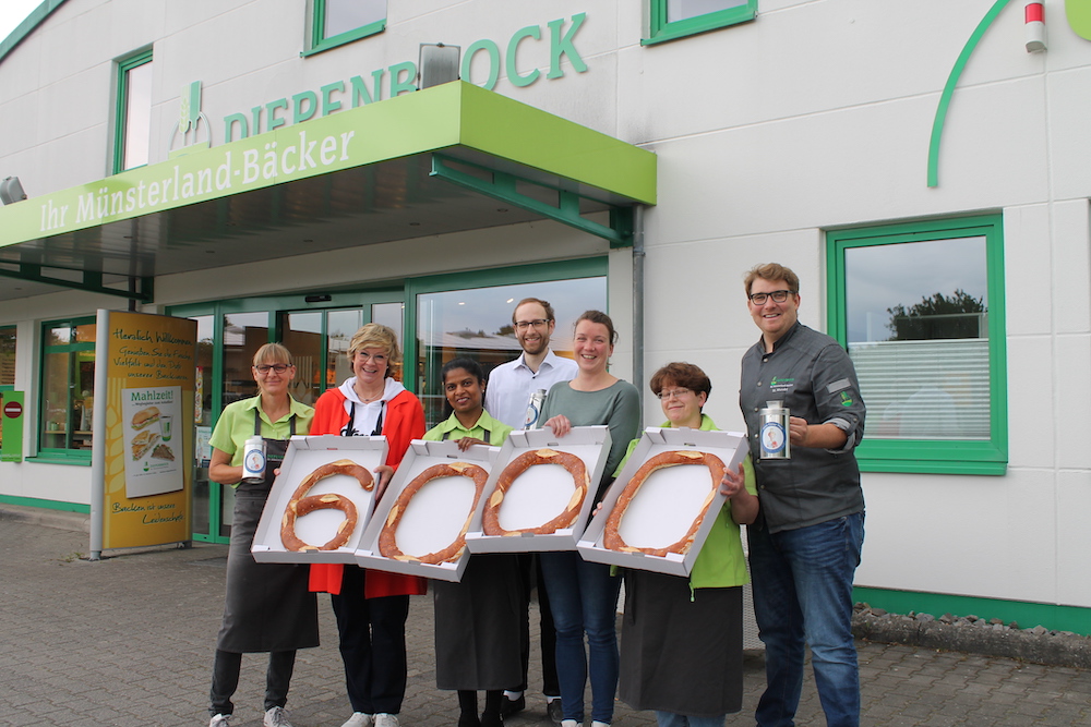 Wer vor den verführerisch leckeren Auslagen in der Theke der Bäckerei Diepenbrock steht, kommt wohl kaum auf die Idee, hier an eine Fastenaktion zu denken. Und doch passt das zusammen. „ Vor vielen Jahren“, erklärt Frau Eichmann, die Assistentin der Geschäftsführung, „hatte unsere Seniorchefin, Frau Mundri, die Idee, während der sechswöchigen Fastenzeit vor Ostern in allen Filialen Sammelbüchsen aufzustellen, um mit dem Erlös ein soziales Projekt zu unterstützen. Zusätzlich verzichteten alle Mitarbeiter in dieser Zeit auf ihr Trinkgeld und ließen auch das dem jeweiligen Projekt zufließen.“ Marco Mundri, der Inhaber der Bäckerei Diepenbroch, ergänzt: „ Unsere Kunden sind mit Flyern und Werbekampagnen auf unsere Aktion hingewiesen worden. So sind in diesem Jahr 3000 Euro zusammen gekommen. Wir haben die Summe dann verdoppelt und können der Aktion Kleiner Prinz nun 6000 Euro zukommen lassen. Das erfüllt uns mit Stolz und Freude. Ein großer Dank gilt unseren Kunden und Mitarbeitern, die trotz der vielen Unsicherheiten, mit denen wir derzeit leben müssen, ihr Herz und ihr Portemonnaie geöffnet haben!“ Dann tragen Mitarbeiter vier große Backwerke herein: aus leckerem Brezelteig sind die Zahlen 6-0-0-0- gebacken und lassen noch einmal anschaulich werden, dass das eine sehr stolze Summe ist. Sylvia Oertker, die Vorsitzende der Aktion Kleiner Prinz, ist begeistert über diese Zuwendung. Sie vereinbart mit Herrn Mundri, dass das Geld je zu einem Drittel der Kreiscaritas zufließen soll und zur Finanzierung der Traumatherapeutin für ukrainische Flüchtlingskinder beiträgt, außerdem soll der Bunte Kreis, der Familien mit früh-oder krank geborenen Kindern hilft, bedacht werden. Schließlich wird das Projekt „Okuja“ (Offene Kinder- und Jugendarbeit) im Ahrtal einen Teil der Spende bekommen. „ Ich weiß dass das Geld bei der Aktion Kleiner Prinz gut aufgehoben ist“, sagt Marc Mundri, und Sylvia Oertker bedankt sich ganz herzlich „ im Namen der Kinder“.