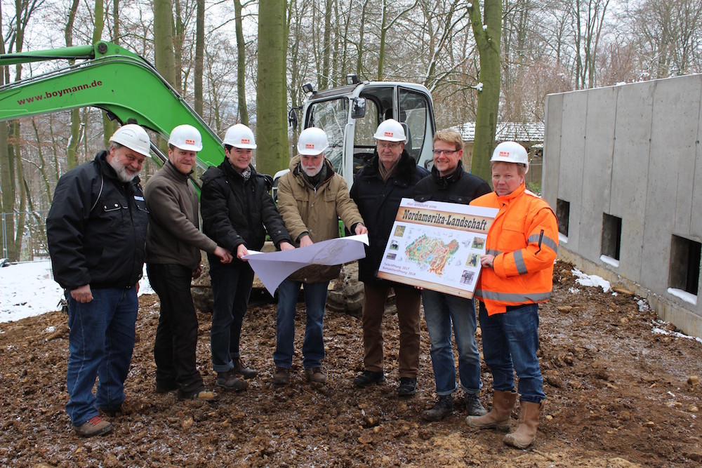 Besucher können die ersten Umgestaltungsmaßnahmen von der linken Brücke zur afrikanischen Tierwelt „Takamanda“ verfolgen, denn der dort angrenzende Wolfswald wird als erste Anlage umgestaltet, wie Bauleiterin Angelika Mösche vom Landschaftsarchitekturbüro Drecker erklärt: „Mit den Bauarbeiten haben wir im Oktober 2016 begonnen. Die Bereiche der Wölfe, Bären und Bisons werden als erste fertiggestellt. Die Wolfsanlage wird in Lage und Größe etwa der bisherigen entsprechen. Zurzeit wird aber noch zusätzlich ein neuer Teich für die Wölfe angelegt und die bisherige Holzplattform erhält eine zweite Anbindung – so wird aus dem Steg ein Rundweg. Der Rundweg wird sich später abschnittweise durch die neuen Tierwelt ziehen“. Zeitgleich mit der Wolfsanlage wird der Bereich für die Bären gestaltet. Die Schwarzbärenanlage entsteht gegenüber der Wolfsanlage, wo zuvor die Sika-Hirsche lebten. Dort werde die Einfriedung wie in der nordeuropäischen Tierwelt „Kajanaland“ in der Optik eines Felsmassivs verkleidet, um ein authentisches Gesamtbild zu erschaffen. „Eine besondere Herausforderung an der Umgestaltung des waldigen Areals sind für uns das starke Geländegefälle und der zum Teil sehr felsige Untergrund“, so Mösche weiter. „Auch der Frost macht es uns natürlich nicht leicht. Aber wir gehen trotzdem davon aus, die ersten Bereiche bis zum Sommer fertig stellen zu können“. Auch der Bisonstall mit Vorgehege wird bis zur Teileröffnung fertig gestellt. Zudem werden sowohl heimische als auch solche Bäume und Sträucher gepflanzt, die in Europa und Nordamerika vorkommen und die Einfriedungen durch Strauchgruppen kaschiert. Damit der erste Teil der Nordamerika-Landschaft im Sommer eröffnet werden kann, sind zurzeit täglich rund acht bis zehn Bauarbeiter auf der Baustelle beschäftigt.