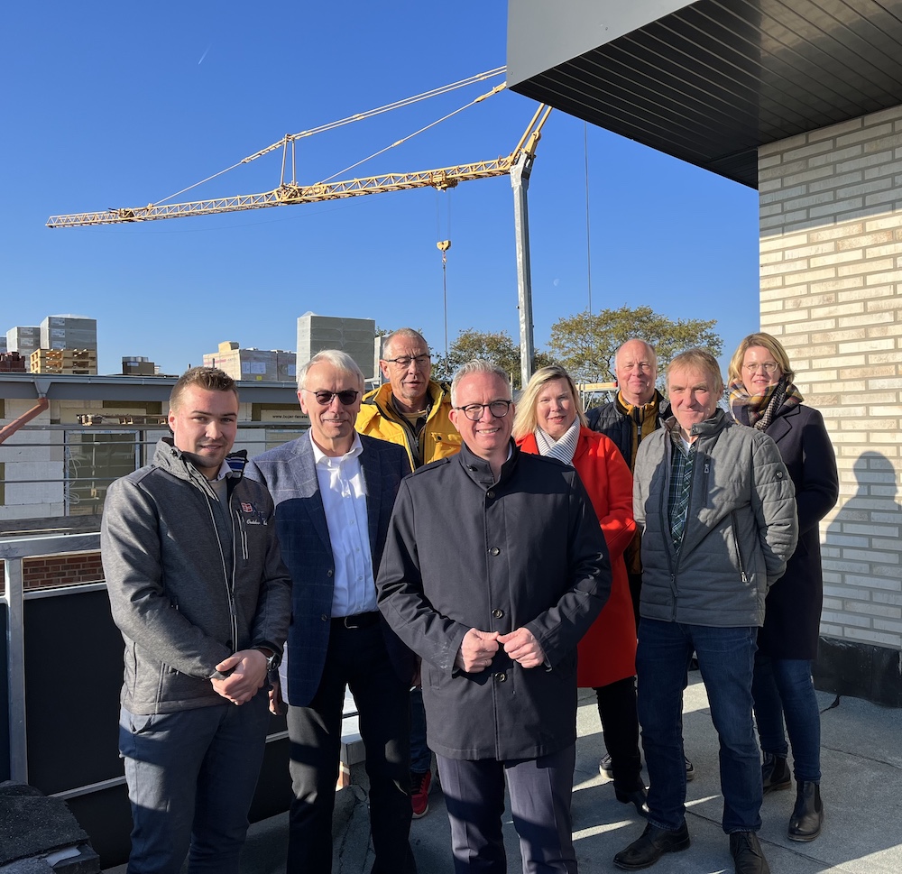 Das Baugebiet „In de Brinke“ im Warendorfer Norden befindet sich derzeit in der Bauphase. Rund 500 eigene Arbeitsstunden in ihr Projekt haben hier auch bereits Marcel Homölle und sein Vater gesteckt. Das Besondere an dem Acht-Parteien-Haus: „Der Treppenturm befindet sich nicht innerhalb des Hauses, sondern wurde außen angebaut. So sparen wir rund 40% der Energie zum Heizen ein“, berichtet der junge Bauherr. Dadurch, dass die Wohnungen zum „Hausflur“ mit einer für den Außenbereich üblichen Isolierung versehen sind und direkt nebeneinander liegen, gehe kaum Wärme verloren und die Wohnungen könnten sich sogar gegenseitig beheizen. Für Bernhard Daldrup und Frank Tischner ein Vorzeigeprojekt: „Hier zeigt sich, welche Möglichkeiten der CO2-Einsparung der Neubau bietet, wenn man an den richtigen Stellschrauben dreht!“