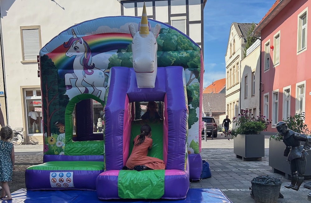 Die große, bunte Einhorn-Hüpfburg lädt letztmalig am Samstag, den 09.08.25, von 11:00–14:00 Uhr zum „Hüpf mit Buddel“ auf den Heumarkt ein. So wird der Besuch in der Stadt für Kinder zum Highlight. (Bei schlechtem Wetter muss die Aktion leider ausfallen.)
