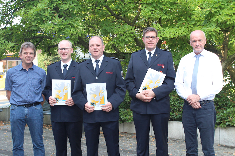 Beelen. „Für die Sicherheit der Beelener Bevölkerung ist der ehrenamtliche Einsatz der Freiwilligen Feuerwehren unverzichtbar. Schon seit Jahren übernimmt Herr Ludger Käuper als Leiter und Herr Ralf Ostholt als stellvertretender Leiter die Geschicke der Freiwilligen Feuerwehr in Beelen. Da die sechsjährige Amtszeit der beiden aktiven Feuerwehrkameraden am 22. Juli ausläuft, musste eine Neubestellung der Leitung der Freiwilligen Feuerwehr ab dem 23. Juli erfolgen. Bereits am 5. Juli hat der Rat der Gemeinde Beelen beschlossen, die Amtszeit von Ludger Käuper und Ralf Ostholt zu verlängern. Beide hatte im Vorfeld signalisiert, die Aufgabe als Leiter beziehungsweise als stellvertretender Leiter der Freiwilligen Feuerwehr Beelen für weitere sechs Jahre zu übernehmen. Zum 23. Juli erfolgte die offizielle Ernennung der beiden durch die Bürgermeisterin der Gemeinde Beelen, Elisabeth Kammann. Sehr erfreulich ist, dass sich Herr Tobias Weber bereit erklärt hat, zunächst kommissarisch die Leitung der Freiwilligen Feuerwehr als weiterer stellvertretender Leiter zu unterstützen. Im Rahmen einer kleinen Feierstunde wurden in diesen Tagen durch den allgemeinen Vertreter, Herrn Erich Lillteicher und Fachbereichsleiter, Manuel Rieping, die offiziellen Ernennungsurkunden überreicht. Beide Verwaltungsvertreter überbrachten auch Grüße und einen Dank von Rat und Verwaltung für diesen engagierten Einsatz.