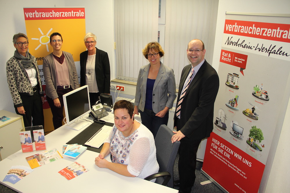 Besichtigten den Raum an der Südstraße, in dem die Verbraucherzentrale in Warendorf ab Montag (27. November) berät: Verbraucherberaterin Daniela Kreickmann (am Schreibtisch) sowie (stehend v.l.)  Anne Middendorf (Leiterin Sozialamt Kreis Warendorf), Dr. Marle Kopf (Regionalleiterin der Verbraucherzentrale NRW), Brigitte Klausmeier (Sozialdezernentin Kreis Warendorf), Anne Schulze Wintzler (Leiterin der Beratungsstelle in Ahlen) und Dr. Ansgar Seidel (Leiter Jobcenter Kreis Warendorf). – (Foto: Kreis Warendorf).