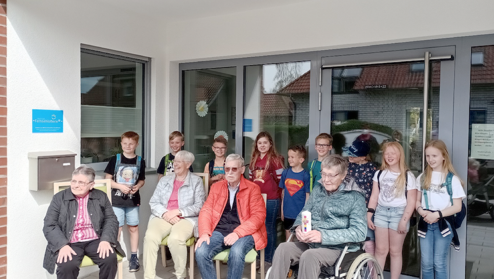 Die Erstkommunionkinder der Klasse 3b haben vor ihren Workshop „Schatzsuche“ einen Abstecher zur „neuen“ Tagespflege in Füchtorf gemacht und eine von ihnen gestaltete Kerze übergeben.