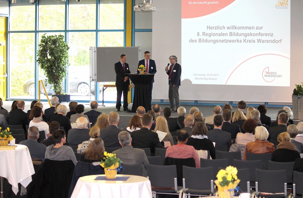 Frühe Bildung und lebenslanges Lernen, Digitalisierung und Fachkräftemangel, Zuwanderung und die demografische Entwicklung – so fasste der Moderator der 8. Regionalen Bildungskonferenz, Dr. Winfried Kösters, die wichtigsten Herausforderungen der Zukunft für eine sich verändernde Bildungslandschaft zusammen. Das Regionale Bildungsbüro des Kreises Warendorf hatte die Konferenz ins Leben gerufen. Sie findet jährlich statt – diesmal im Berufskolleg Beckum.