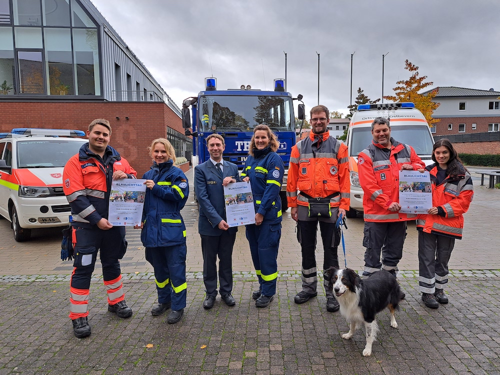 Freuen sich auf viele Besucher am Sonntag: Alexander Jahn (MHD), Anna-Lena Raab, Mario Raab und Stephanie Stepputat (THW Warendorf), Andre Doodt (DRK-Rettungshunde) mit Hund Günni sowie Sven Pawlitzki und Jill Pawlitzki (DRK Ostbevern)