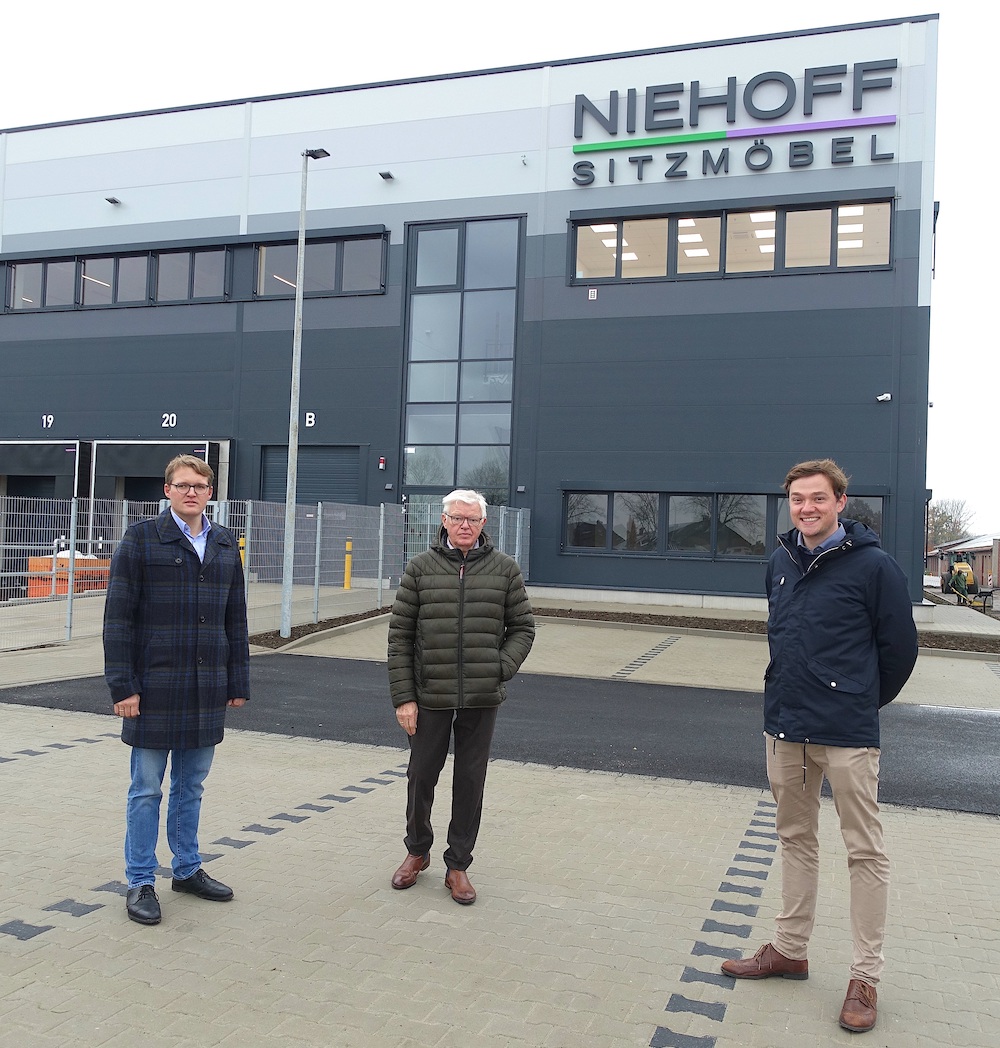 In Freckenhorst tut sich etwas. Davon konnte sich Bürgermeister Peter Horstmann während seines Besuches am neuen Logistiklager von Niehoff Sitzmöbel überzeugen. Fast 10 Millionen Euro hat sich das Freckenhorster Unternehmen den Neubau kosten lassen. Für die Geschäftsführer Theo und Bernd-Theo Niehoff stellt er einen ganz wichtigen Meilenstein in der Firmengeschichte dar. „In unserer neuen Halle können wir die vielen Wege einsparen, die wir bisher zwischen den einzelnen Standorten absolvieren mussten.“, freuen sie sich. An 24 Toren können die LKW demnächst be- und entladen werden.
