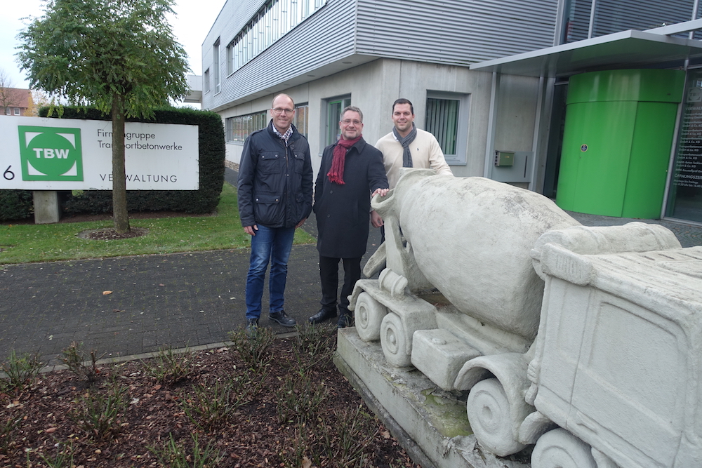 Bürgermeister Axel Linke war zu Gast beim Transportbetonwerk Warendorf an der Waterstroate. Die beiden Geschäftsführer Thomas Schlütting und Daniel Breuer stellten ihm das Unternehmen vor, das bereits seit über 50 Jahren von Warendorf aus große und kleine Baustellen im Umkreis von ca. 30 km mit Fertigbeton beliefert. Von Warendorf aus werden auch die TBW-Betonwerke in Münster, Beckum, Drensteinfurt und Selm mit verwaltet. In den eigenen Mischwerken werden verschiedenste Betonsorten hergestellt und mit über 40 eigenen Fahrmischern an die Baustellen geliefert. Auch vier große, mobile LKW-Betonpumpen gehören zum Fuhrpark. Sie können den Beton auf der Baustelle auf Distanzen von über 40 Metern befördern.