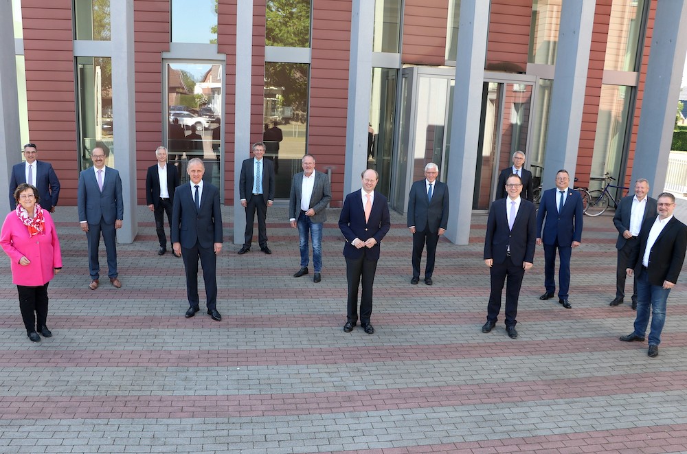 Dienstbesprechung mit Abstand auch beim Gruppenbild: Erstmals seit Beginn der Corona-Epidemie fand eine Konferenz der Bürgermeister mit dem Landrat statt, im Bild v.l.: Elisabeth Kammann (Beelen), Dr. Alexander Berger (Ahlen), Carsten Grawunder (Drensteinfurt), Wolfgang Pieper (Telgte), Dr. Karl-Uwe Strothmann (Beckum), Berthold Streffing (Sendenhorst), Berthold Lülf (Ennigerloh), Landrat Dr. Olaf Gericke, Josef Uphoff (Sendenhorst), Sebastian Seidel (Everswinkel), Karl-Friedrich Knop (Oelde), Christian Thegelkamp (Wadersloh), Wolfgang Annen (Ostbevern) und Axel Linke (Warendorf). – (Foto: Kreis Warendorf).