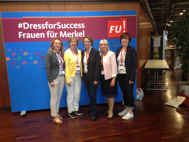 „Wir trugen bunte Poloshirts in den Farben aubergine, pink, orange, blau und grün in Anlehnung an die farbigen Blazer von Bundeskanzlerin Angela Merkel. Die Kanzlerin hat uns mit ihrer frauenpolitischen Rede begeistert und die Frauen aus ganz Deutschland haben mit stehenden Ovationen Angela Merkel gefeiert“, erklärt Elke Duhme, Vorsitzende der Frauen Union Kreis Warendorf-Beckum.