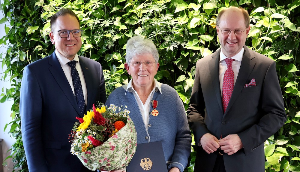Hildegunde Grabenmeier erhielt die Verdienstmedaille für ihr langjähriges Engagement. Landrat Dr. Olaf Gericke (l.) und Bürgermeister Sebastian Seidel (r.) gratulierten herzlich zu dieser hohen Auszeichnung. – Foto: Kreis Warendorf