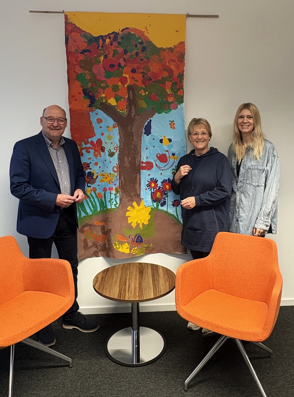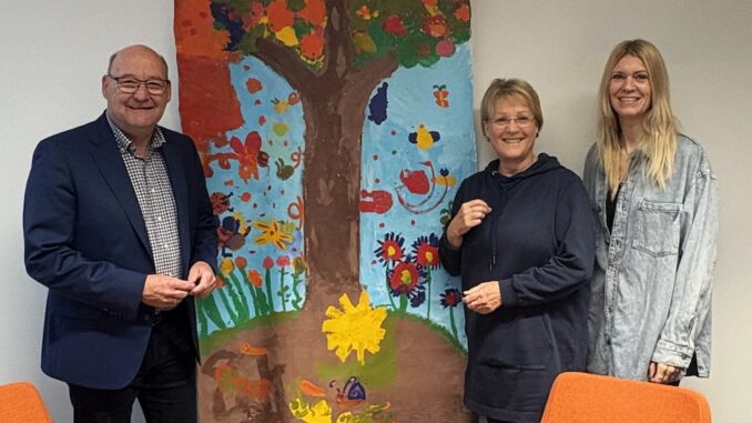 „Dieses farbenfrohe Unikat erinnert uns daran, wie wichtig Kinder, Kreativität und Gemeinschaft sind“, so die Touristikerinnen. Bürgermeister Karl Piochowiak freut sich, dass die bunte Fahne nun ihren Platz in seinem Büro gefunden hat.