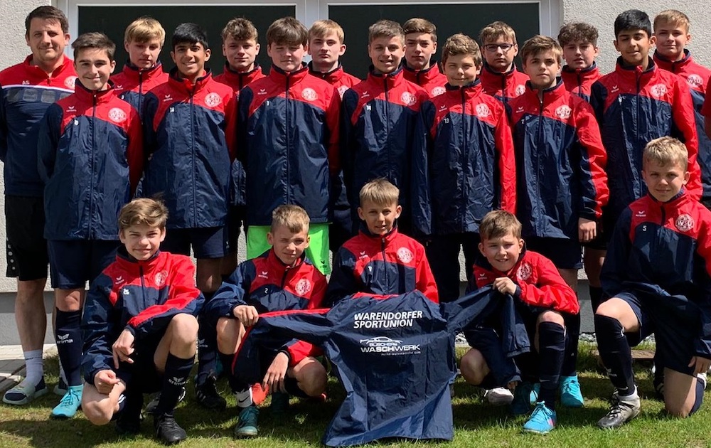 Neue Aufwärmpullover spendierte Tobias Lüffe-Baak, Geschäftsführer der Heinrich Lüffe-Baak GmbH & Co.KG aus Harsewinkel-Greffen, den C2 Fussballern der Warendorfer SU. Für das richtige Outfit auch bei Regenwetter sorgten