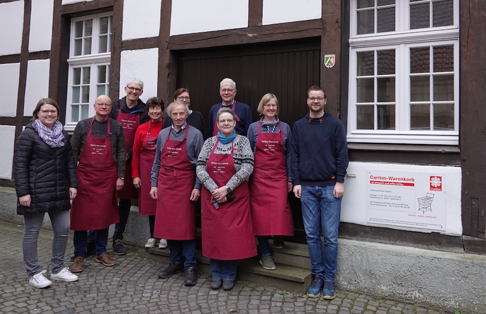 Träger des Warenkorbes ist der Caritasverband im Kreisdekanat Warendorf e. V.. Dort unterstützt Kathrin Wiggering, Referentin im Fachbereich Gemeindecaritas, das Team aus Ehrenamtlichen. Sie hilft bei vielen organisatorischen Fragen und sorgte u.a. im Dezember per Presse und Facebook für den Aufruf zum ehrenamtlichen Engagement in der neuen Samstagsausgabe. Recht schnell haben sich 25 Personen gemeldet, die neu oder an zusätzlichen Tagen im Warenkorb mithelfen möchten. Bei einem Treffen zum Kennenlernen konnten sie dann Anfang Februar einen Eindruck vom Warenkorb und den Abläufen dort gewinnen und sich in den Dienstplan eintragen. Jede Ausgabegruppe besteht aus 6 bis 7 Personen.