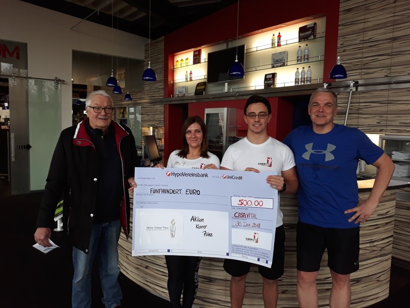 Bereits zum zweiten Mal war die Aktion Kleiner Prinz – Internationale Hilfe für Kinder in Not e.V. als Empfängerin der Spende ausgewählt worden. Am 30. Dezember überreichten Studioleiterin Irina Hornung, Trainer Devrim Al und Organisator und Haupttrainer des „Indoor Cycling“ Olaf Homann einen symbolischen Spenden-Scheck an Wolfgang Wohlgemuth von der Aktion Kleiner Prinz.