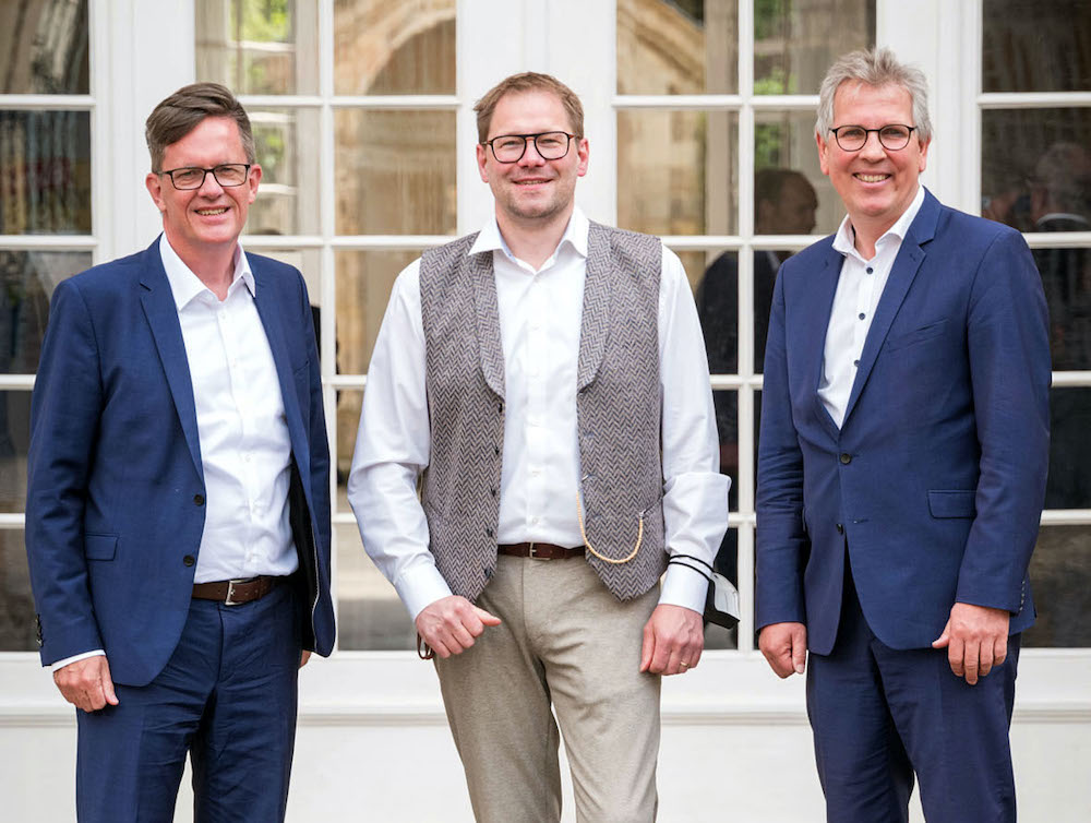 Christoph Berger (M.), Inhaber des Modehauses Ebbers in Warendorf, ist neuer Vorsitzender im Handelsausschuss der IHK Nord Westfalen und damit Nachfolger von Michael Radau (r.). Zu den ersten Gratulanten gehörte der Ausschussbetreuer, IHK-Abteilungsleiter Jens von Lengerke.