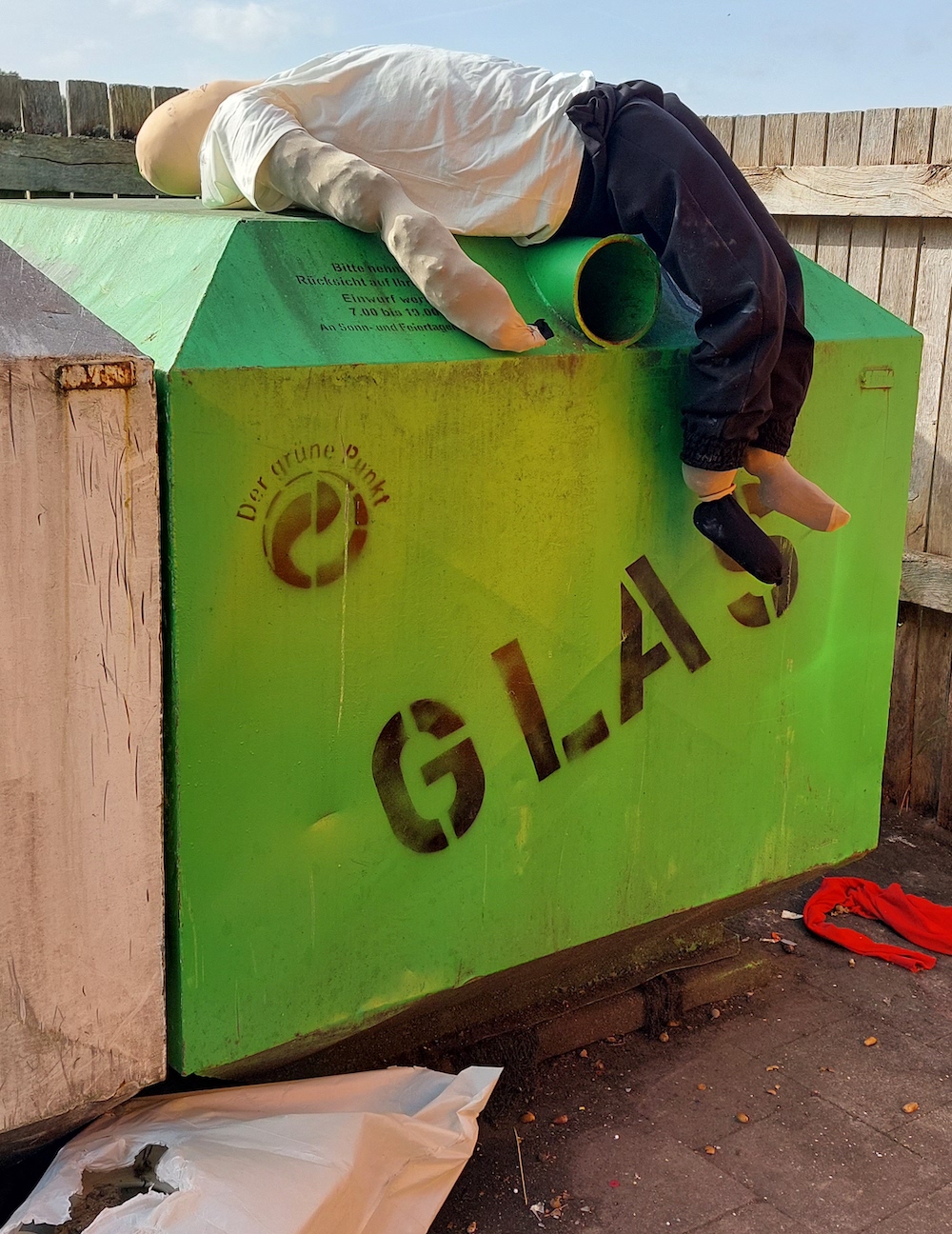 Leider kommt es immer wieder vor, dass die Container-Standorte in Sassenberg und Füchtorf als Entsorgungsstation für Abfälle aller Art missbraucht werden. Ein etwas skurriler Fall dieser Unart konnte in dieser Woche am Container-Standort am ALDI beobachtet werden. Auf dem dortigen Altglas-Container haben vermutlich nicht ganz so schlaue Zeitgenossen eine Strohpuppe „entsorgt“. Die Stadtverwaltung bittet um Hinweise zum möglichen Verursacher.