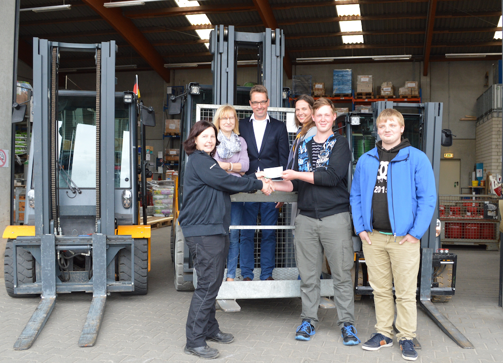 Unser Foto zeigt: Auszeichnung für besonderes Engagement: Meik Enninghorst und Patrick Doolan (von rechts) erhalten den Staplerschein aus der Hand von DEULA-Lehrerin Bianca Neubert. Hildegard Reher, Björn Plaas und Laura-Jill Wilms (von links) freuen sich mit ihnen.
