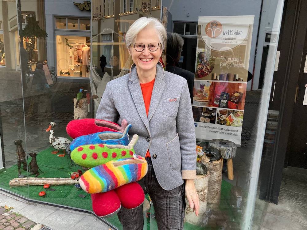 Auf dem Bild zeigt Leonore Berger eine Auswahl der Dessins, in denen es die Filzpuschen gibt, vor dem Lädchen. (Foto: CVJM)