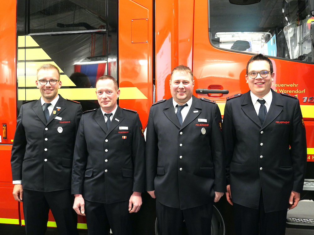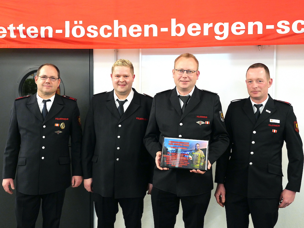 Zum Feuerwehrmann des Jahres konnte in diesem Jahr nur einer gewählt werden: Lars Recker (2. von rechts), ehemaliger stellvertretender Wehrführer, der 2025 nach Jahren intensiver, nerven- und kräftezehrender – ehrenamtlicher (!) – Arbeit, mit großem Verständnis der Wehr seinen Hut aus dem Ring nahm. Ihm gratulierten André Mertens, Keven Rose und Dirk Dollmann (v. li.)