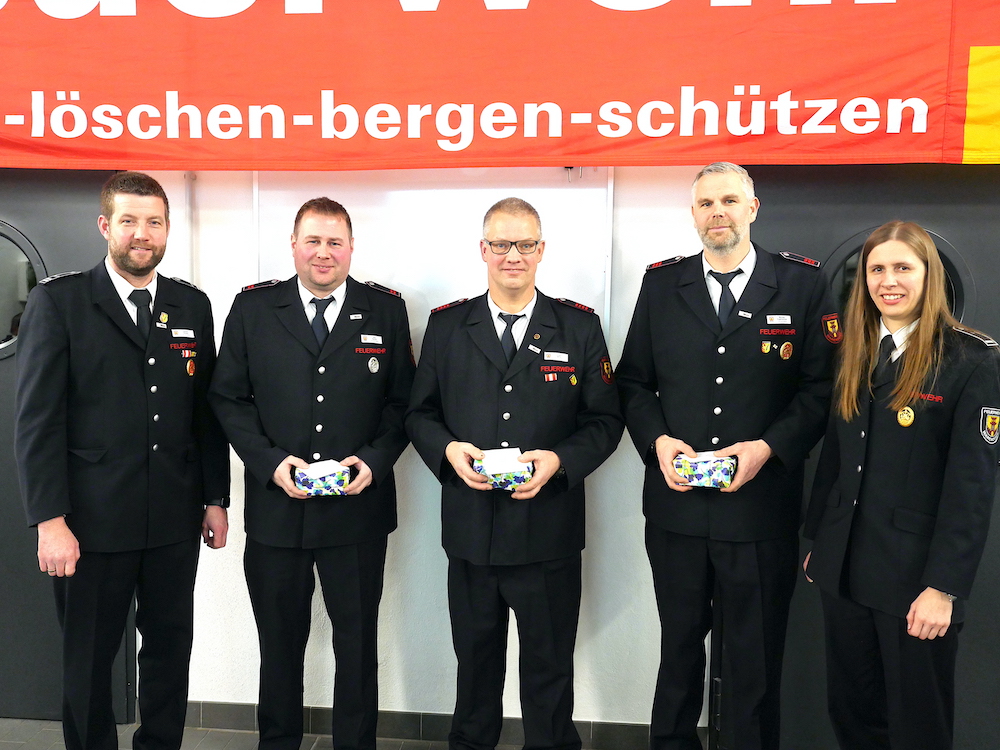 Einheitsführer Carsten Recker (li.) und seine Stellvertreterin Andrea Ohlmeier (re.) bedankten sich bei Nils Recker, Jürgen Witte und Michael Eggelnpöhler (v. li.)