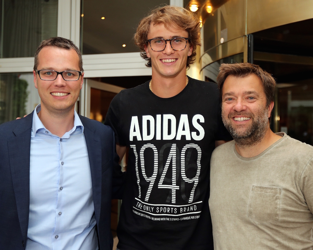 Deutschlands Tennis-Superstar Alexander Zverev (Mitte) ist in HalleWestfalen eingetroffen und wurde von Alexander Hardieck (links) und Thorsten Liebich (beide Turnierdirektion GERRY WEBER OPEN) vor dem GERRY WEBER SPORTPARK HOTEL bei seiner Ankunft begrüßt.