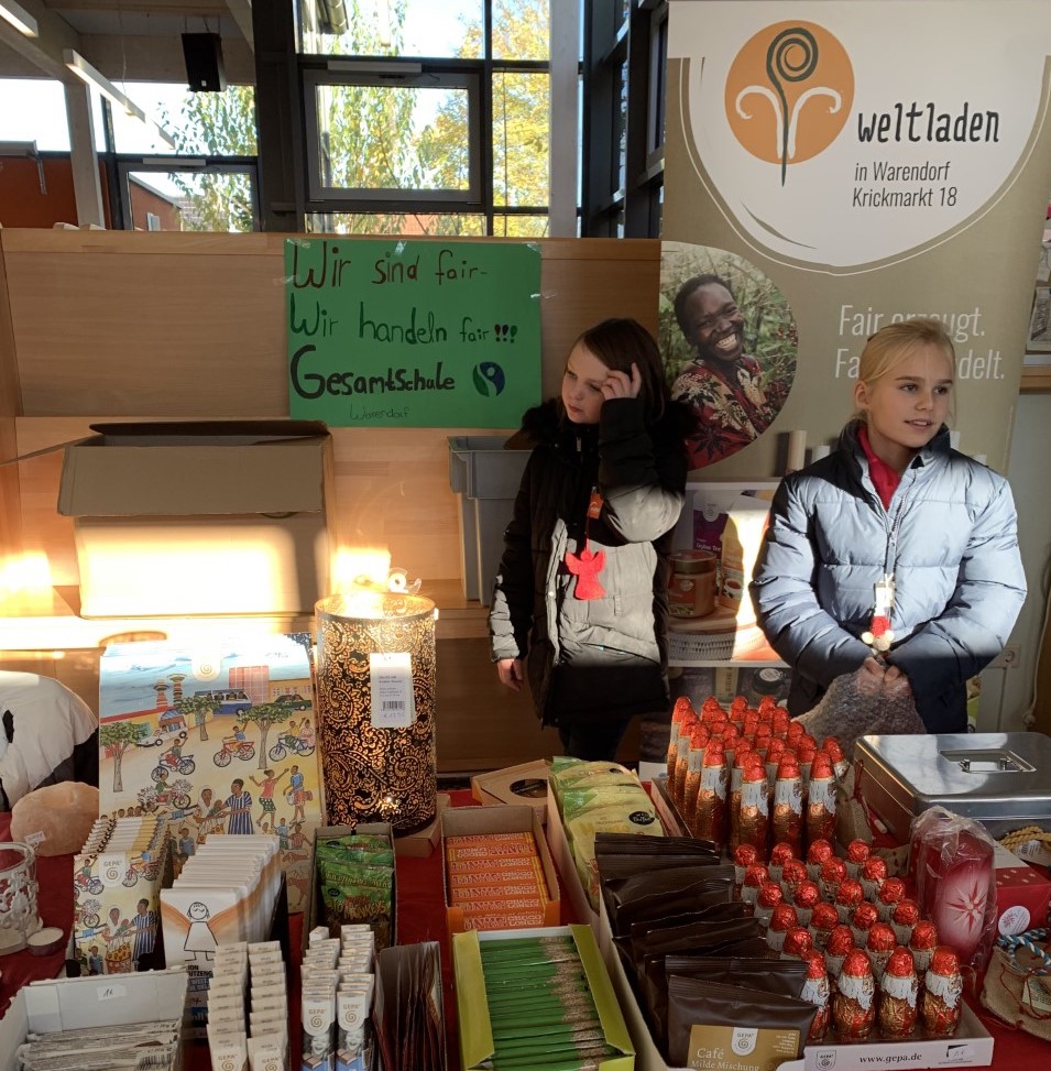 Den Tag der Offenen Tür an der Gesamtschule nutzen die Schülerinnen und Schüler der Klasse 5a und ihre Lehrerinnen Marita Bils-Weymerich und Judith Zeus, um auf den Fairen Handel hinzuweisen. Der Warendorfer Weltladen stellte ihnen dafür ein kleines Sortiment zusammen, das sowohl bei den Schülerinnen und Schülern wie auch den Eltern viel Anklang fand.