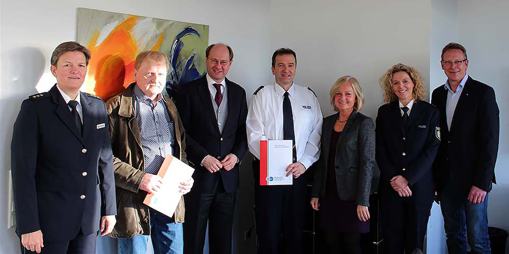 v.l. Leiterin der Direktion GE, Andrea Mersch-Schneider, Gerd Erdmann, Landrat Dr. Olaf Gericke, Dietmar Schulte, Leiterin der Direktion ZA, Susanne Hassink, Abteilungsleiterin Polizei, Katja Kruse, Personalratsvertreter Jürgen Gausebeck. (Foto: Kreis Warendorf)