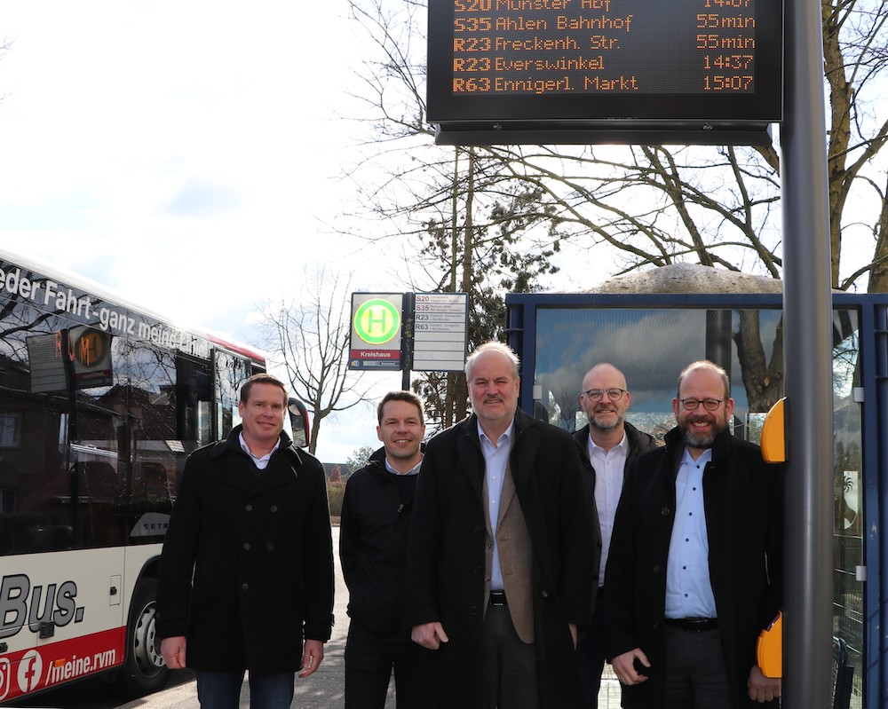 Der neue digitale Haltestellen-Anzeiger an der Bushaltestelle „Kreishaus“ bietet den Fahrgästen zusätzlichen Komfort. Carsten Linge (RVM), Steffen Lanwert (WB), André Pieperjohanns (Geschäftsführer RVM), Martin Terwey (Leiter Amt für Planung und Naturschutz Kreis Warendorf) und Dr. Herbert Bleicher (Kreisplanungsdezernent und RVM-Aufsichtsratsvorsitzender) überzeugten sich von der Funktionsfähigkeit.