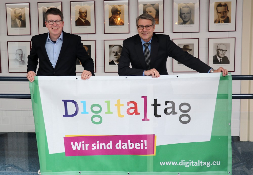 Matthias Kraemer und Kreisdirektor Dr. Stefan Funke (v.l.) machen auf die Aktionen des Kreises zum Digitaltag aufmerksam. – Foto: Kreis Warendorf