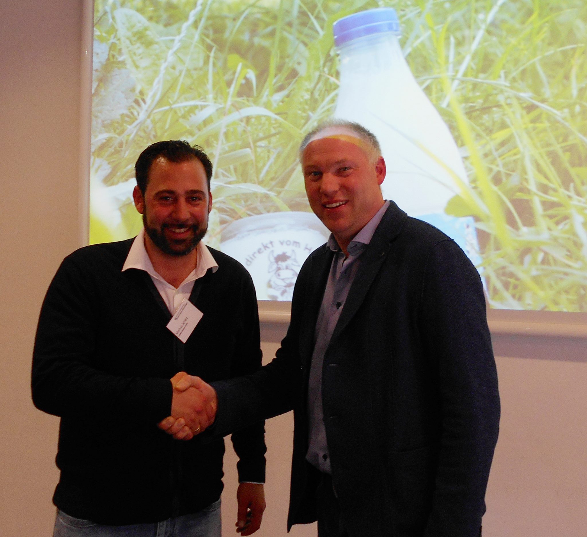 Markus Scholz (l.), Kaufmann aus Sassenberg, bezieht regionale Milchprodukte von Leonhard Große Kintrup aus Handorf.