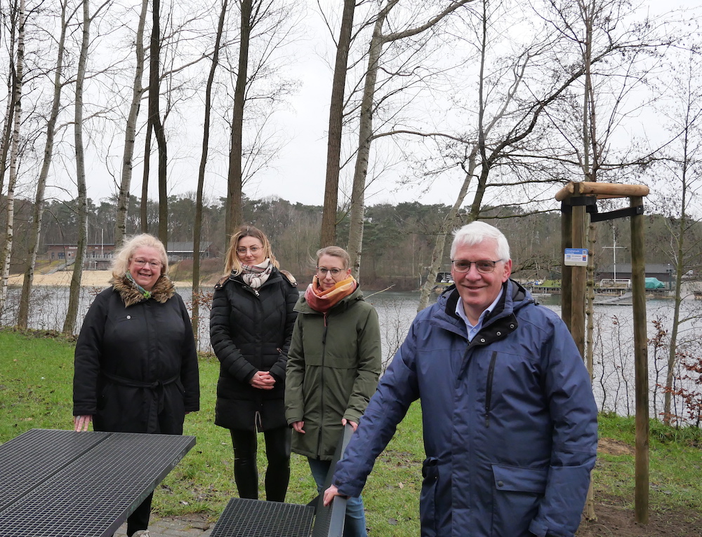 Schon in wenigen Jahren wird der Kugelfeldahorn, der hinter Bürgermeister Uphoff zu sehen ist, dem Rastplatz wohltuenden Schatten spenden. Gemeinsam mit Petra Rosenbach (Tourismusgesellschaft Osnabrücker Land), Olga Puttins (Stadt Sassenberg), und Heike Albers (Tourismusgesellschaft Osnabrücker Land), stellte Bürgermeister Josef Uphoff das Projekt vor (v.li.)
