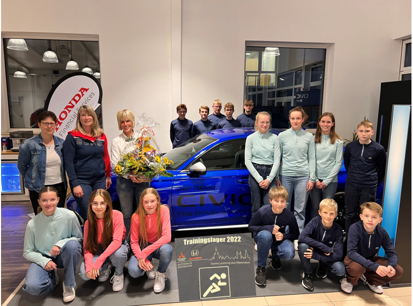 Die jugendlichen Sportlerinnen und Sportler der LG Ems und ihre Trainerinnen Birgit Lerchner und Tanja Donath bedanken sich herzlich beim Autohaus Strohbücker aus Warendorf für die Unterstützung. Das Autohaus sponsert jedes Jahr etwas fürs Trainingslager – dieses Mal langärmlige Laufshirts – die natürlich ganzjährig beim Training und zur Erwärmung bei Wettkämpfen in ganz NRW und darüber hinaus getragen werden. „Ein großes Dankeschön an Nina Strohbücker und ihr Team für ihr Engagement! Wir hoffen auch in Zukunft auf die Unterstützung, allerdings dann in den Farben der WSU statt der LG Ems, da sich diese Abteilung leider zum Jahresende auflöst”, so Trainerin Birgit Lerchner.