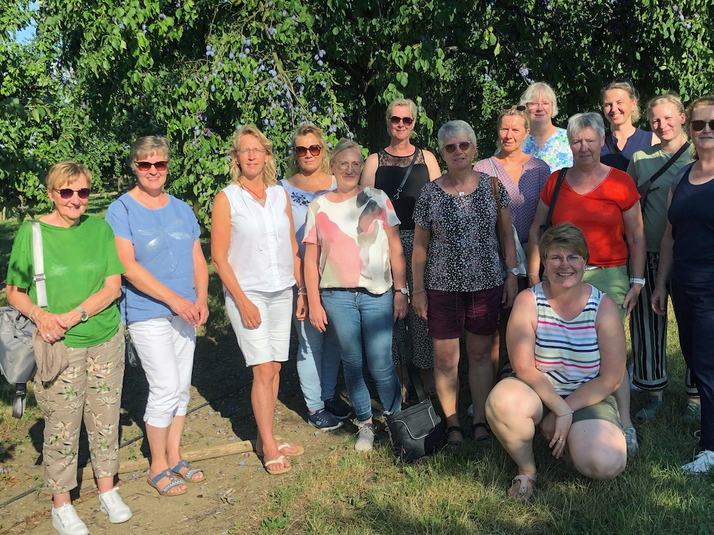 Da die Ernte derzeit auf Hochtouren läuft, hatten die Unternehmerfrauen nach dem Genuss des selbst gebackenen Pflaumenkuchens auch noch die Gelegenheit, unter Führung von Marion Stemich einen Spaziergang zu einer Anbaufläche zu machen, wo der Pflaumenbaumschüttler im Einsatz war.