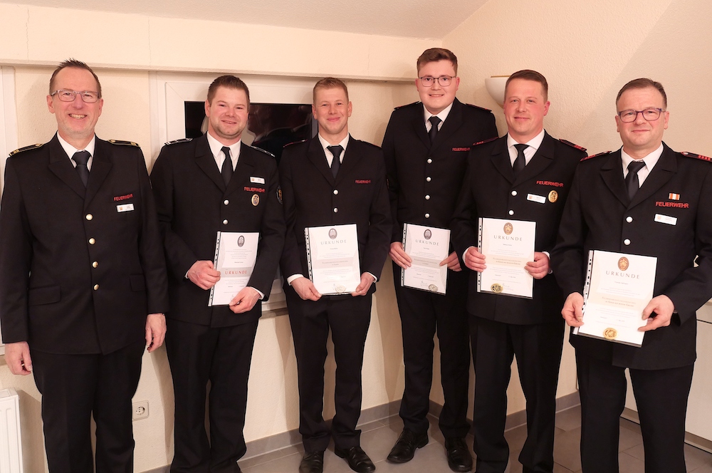 Wehrführer Frank Sölken überreichte Die Urkunden und Leistungsabzeichen an Gruppenführer Daniel Micke, sowie an die anwesenden Tom Picker und Florian Micke (beide Silber), Markus Arens (Gold, 10 Teilnahmen) und Thomas Hartmann (Gold, 15 Teilnahmen) (von links)