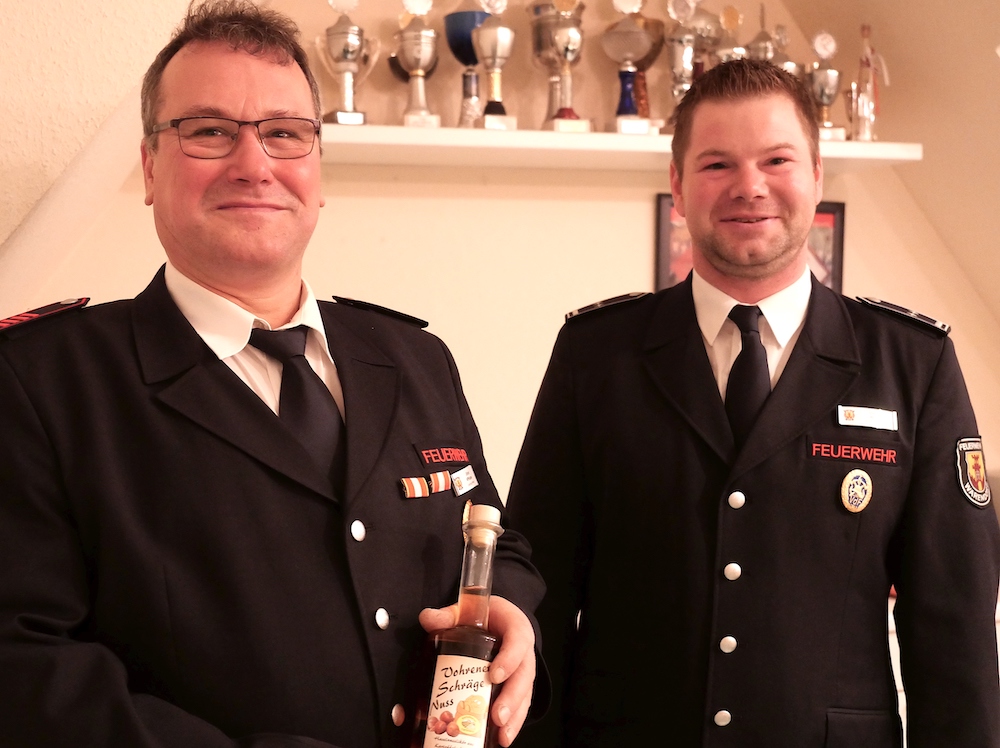 24 Prozent schmackhafte Vohrener Schräge für 100 Prozent Dienstbeteiligung – und das nicht zum ersten Mal. Ulrich Affhüppe (links) erhielt von Einheitsführer Daniel Micke ein verdientes Präsent.
