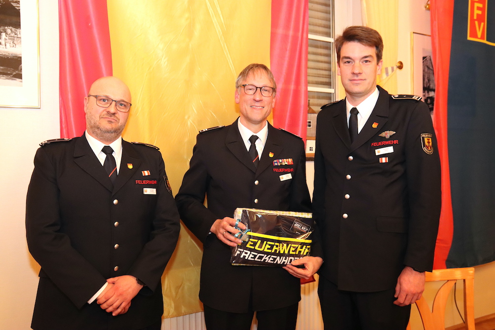 Mit langanhaltendem Applaus verabschiedeten die Mitglieder ihren scheidenden Einheitsführer Christian Reinker. Seine bisherigen Stellvertreter Christoph Peveling (links) und sein Nachfolger Sebastian Hoeps (rechts) überreichten ihm ein Geschenk.