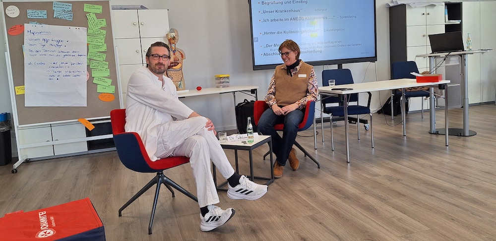 Eine dieser Kooperationen besteht mit dem Ameos Klinikum Warendorf. Stephanie Jansen und ihr Team von der Ausbildungskoordination Pflege hatten einen abwechslungsreichen und informativen Tag vorbereitet. Los ging es mit einer Präsentation mit umfassenden Informationen über die einzelnen medizinischen Einrichtungen und Fachabteilungen. Fünf Mitarbeitende des Klinikums standen für ein „Speed Dating“ zur Verfügung, bei dem sie wechselnden Kleingruppen ihren Ausbildungsweg und ihre Arbeitsbereiche vorstellten und alle Fragen im offenen Gespräch beantworteten. Auf einer anschließenden Erkundungstour konnten die Schülerinnen und Schüler hinter die Kulissen schauen und Bereiche wie die Notaufnahme, die Kardiologie und die Privatstation kennenlernen. Der Internist Dr. Peter Schürmann stand beim Programmpunkt „Der Medicus“ seiner Interviewpartnerin Stephanie Jansen Rede und Antwort und gab Einblicke in den Werdegang eines Mediziners und die Tätigkeiten im Krankenhaus.