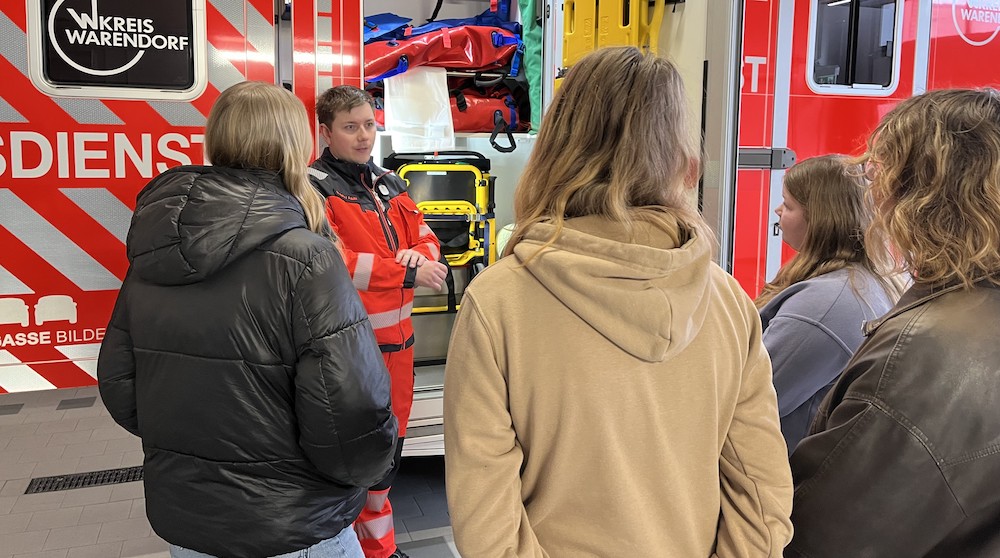 Ein Besuch bei der Kreisverwaltung ließ eine Vielfalt interessanter Berufsmöglichkeiten aus den Bereichen Gesundheit, Soziales und Pädagogik entdecken. So erfuhren die Schülerinnen und Schüler bei der Kreispolizeibehörde, welche Voraussetzungen man für eine Bewerbung bei der Polizei mitbringen muss und wie das Duale Studium abläuft. Sie durften ein Polizeiauto aus der Nähe erkunden und die Arbeit des Erkennungsdienstes kennenlernen. In der Rettungsleitstelle durften sie einen simulierten Notruf absetzen und lernten, wie die Ausbildung im Rettungsdienst abläuft. Natürlich wurde auch ein Rettungswagen mit all seinem Zubehör in Augenschein genommen. Auch eine Beschäftigung im Jugendamt ist eine mögliche Berufsperspektive. Dorthin führt das Studium der Sozialen Arbeit, wie Daniel Bögge, Leiter des Sachgebiets Soziale Prävention und frühe Hilfen im Amt für Kinder, Jugendliche und Familien des Kreises Warendorf erläuterte. Durch die hervorragende Organisation und das hohe Aufgebot an Akteuren von Seiten des Kreises konnten die Schülerinnen und Schüler hier wertvolle Eindrücke gewinnen.