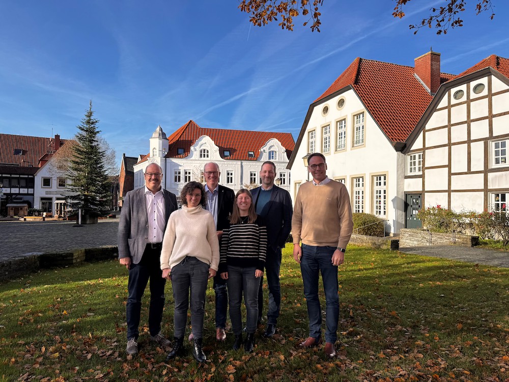Die beiden CDU-Landtagsabgeordneten Markus Höner (r.) und Daniel Hagemeier (3.v.l.) suchten das Gespräch mit den Akteuren hinter „9Plus Kreis Warendorf e.V.“: Vereinsvorsitzender und Drensteinfurter Bürgermeister Carsten Grawunder, Regionalmanagerin Pia Weischer sowie Dr. Frank Bröckling und Sophia Lemm vom beratenden Büro „planinvent“ in Münster (v.l.).