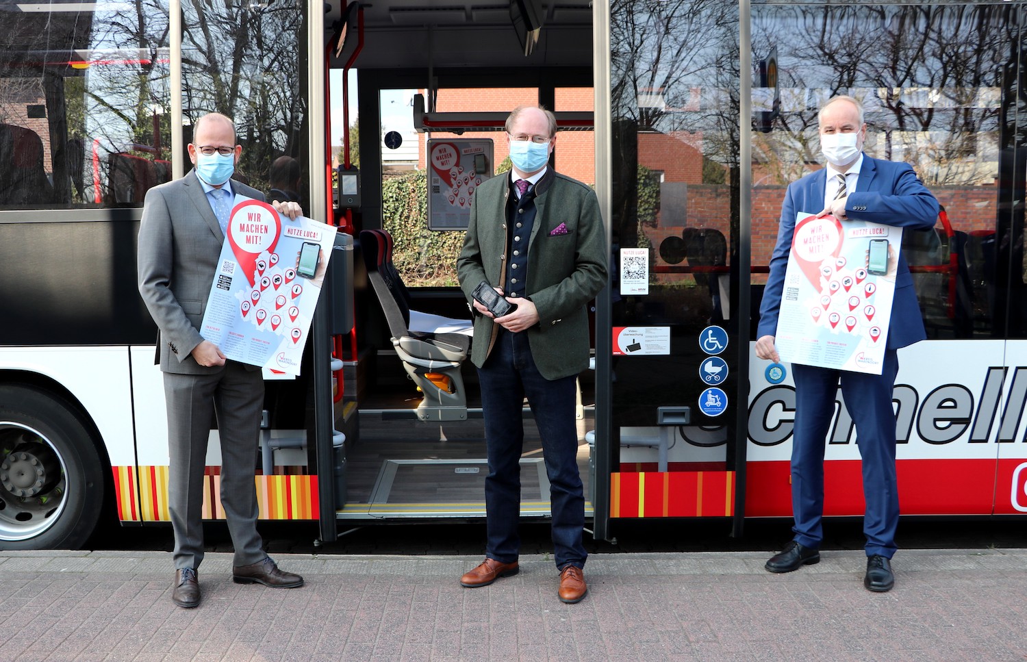 Versprechen sich eine noch bessere Kontaktnachverfolgung durch den Einsatz der luca-App: Dr. Herbert Bleicher, Verkehrsdezernent des Kreises und Aufsichtsratsvorsitzender der RVM, Land-rat Dr. Olaf Gericke und André Pieperjohanns, Geschäftsführer RVM.