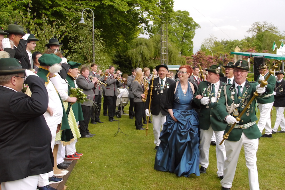 Sonntags ist dann Schützenfest mit allem Drum und Dran. Situationsbedingt findet das Antreten um 10:45 Uhr auf dem Parkplatz der Firma Goldmann statt. Von hier marschieren die Formationen zunächst „Zur Sonne“, danach zum Ehrenmal zur Kranzniederlegung. Erst dann, ca. 12:15 Uhr, folgt die Parade, allerdings aus genannten Gründen nicht auf dem Markt- sondern dem Kirchplatz St. Laurentius. Und dann geht es im langen Marsch zum Freibad, wo um 14:15 Uhr das Vogelschießen beginnen soll. Platzkonzert, Tombola und Kaffeetafel, sowie das Hampelmannschießen der Ehrengarde füllen den Nachmittag. Erst um 19:00 Uhr treten die Schützen zur Krönung an, die ihren Abschluss im feierlichen „Großen Zapfenstreich“ findet. Gegen 20:00 Uhr beginnt der Königsball mit der Partyband Voice & Voice.