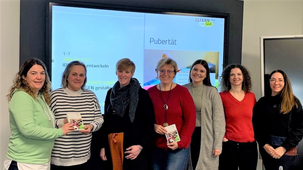 Laden zum Elterntalk: Rita Niemerg (Amt für Jugend und Bildung), Ulrike Klemann (Fachdienst für Integration und Migration Caritasverband Kreisdekanat Warendorf), Vanessa Käller (Elterntalk-Moderatorin), Bianca Klak (Elterntalk-Moderatorin), Miriam Gösling (Regionalbeauftrage Elterntalk NRW – Amt für Jugend und Bildung), Ana Trancota (Elterntalk-Moderatorin) und Dilek Schörder (Elterntalk-Moderatorin).