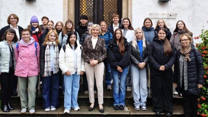 Eine Gruppe von zehn Schülerinnen und Schülern aus Warendorfs polnischer Partnerstadt Olesnica ist am Morgen mit ihren deutschen Gastgebern von der stellvertretenden Bürgermeisterin Doris Kaiser im historischen Rathaus der Stadt Warendorf empfangen worden.