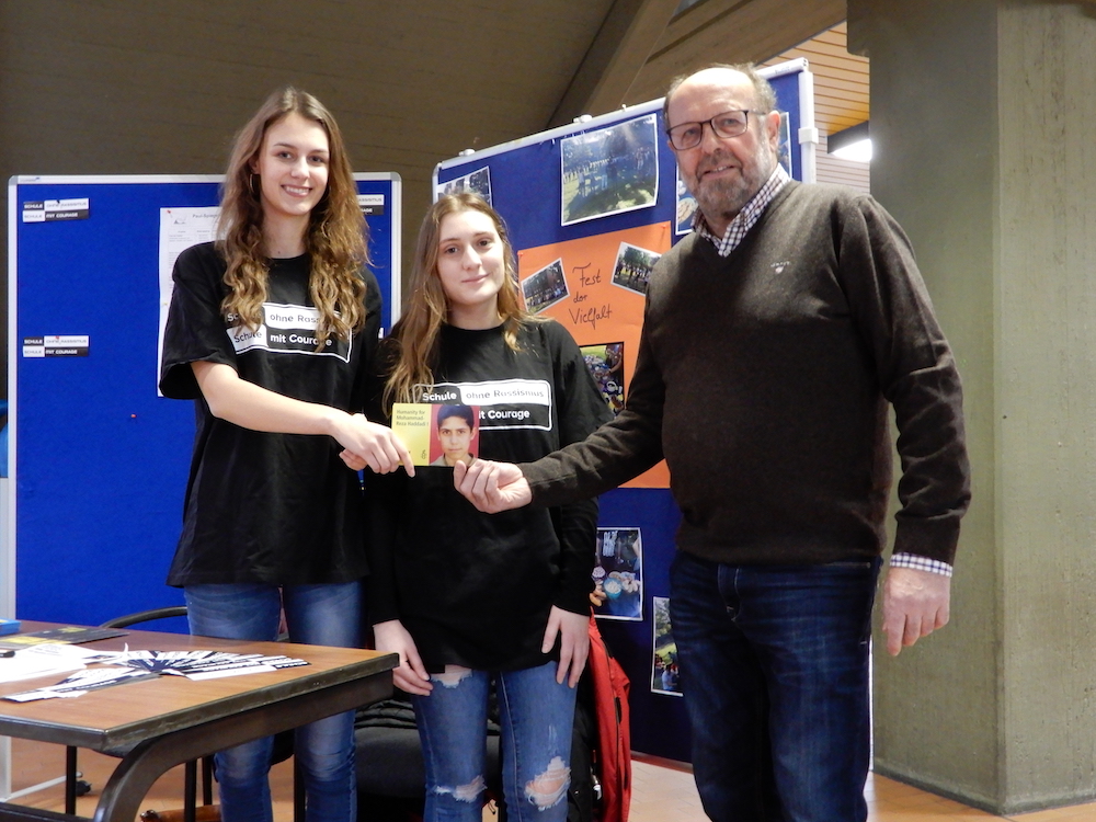 Sarah Kaldewey und Sophie Kramer (von links) überreichten Peter Bloemen, Gruppensprecher der Warendorfer Gruppe von Amnesty International, 45 Postkarten an den iranischen Justizminister Ayatollah Larijani. Im Rahmen der europäischen Jugendinitiative „Schule ohne Rassismus – Schule mit Courage“ hatten sich die Schülerinnen am Infotag des Paul-Spiegel-Berufskollegs für den 29jährigen Mohammad Reza Haddadi eingesetzt, der nach einem unfairen Prozess seit fast 14 Jahren im Todestrakt auf seine Hinrichtung wartet.