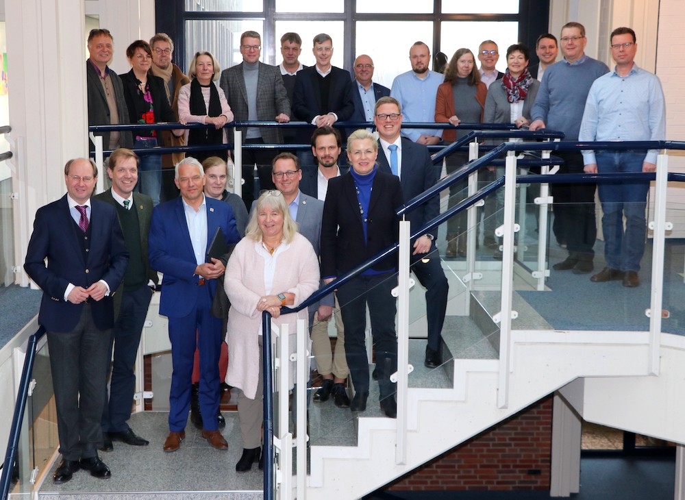 Landrat Dr. Olaf Gericke (vorne l.) begrüßte die Gäste aus dem Kreis Coesfeld, darunter auch Landrat Dr. Christian Schulze Pellengahr (vorne 2.v.l.), im Warendorfer Kreishaus.