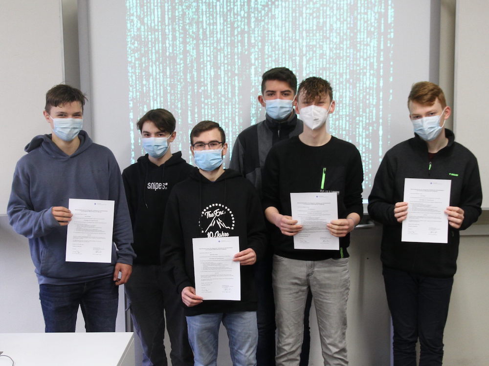 Nikita Funk, Finn Hennemann, Tim Hüwe, Ole Lemnitzer, Maximilian Türing, (alle Gymnasium Laurentianum) und Tio Thoben (Mariengymnasium) haben nicht nur während der Vorbereitung herausragendes Engagement gezeigt, sondern teils auch erste Leistungspunkte für ein späteres (Wirtschafts-)Informatikstudium erhalten. Schulleiter Malte Prigge und Informatiklehrer Henning Vaut freuten sich mit ihnen und überreichten ihnen Glückwünsche und ihre wohlverdienten Zertifikate.