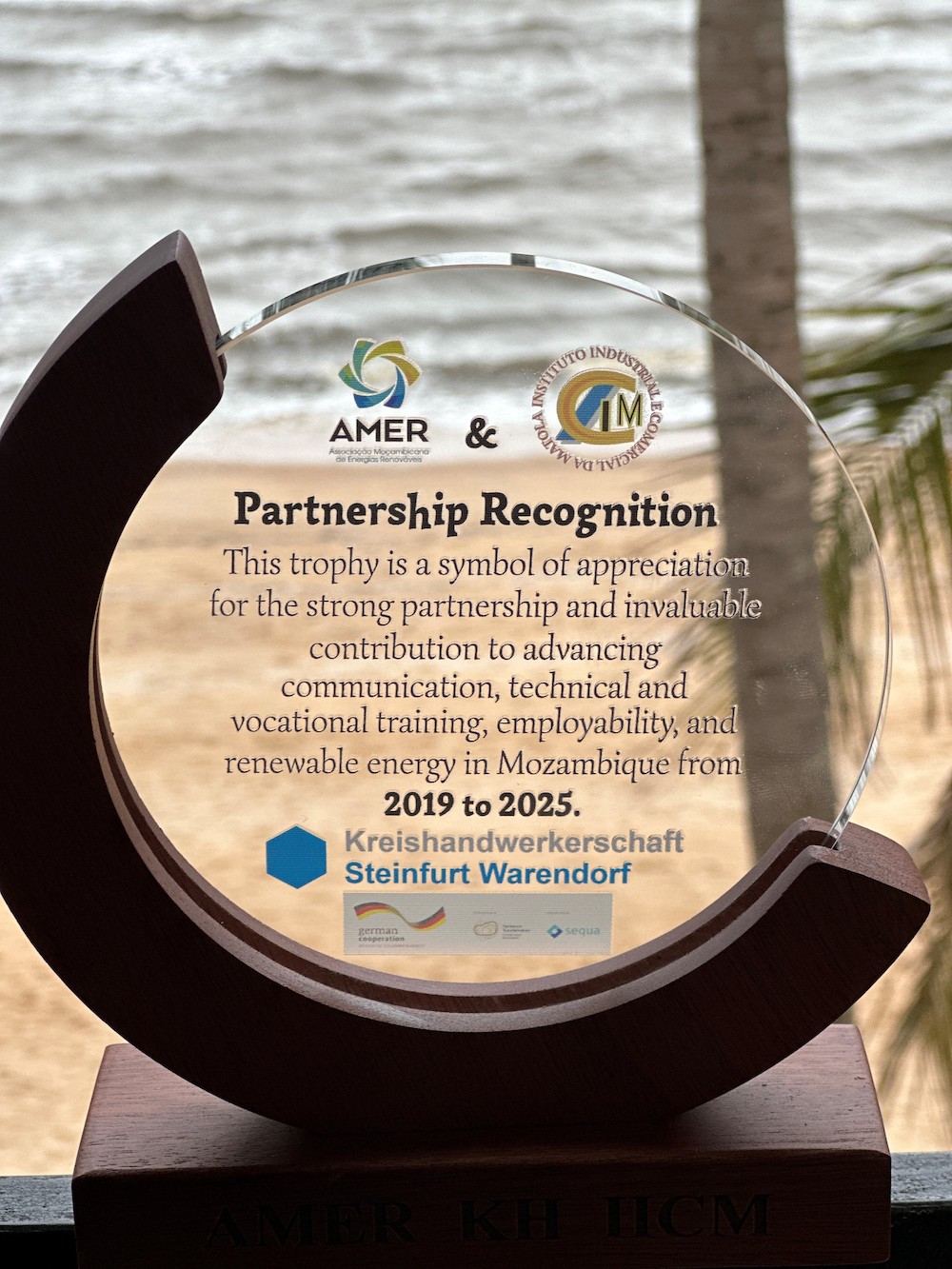Eine Glastrophäe als Anerkennung des erfolgreichen Engagements bekamen Heinz-Bernd Lohmann und Frank Tischner bei ihrem Besuch in Mosambik überreicht.