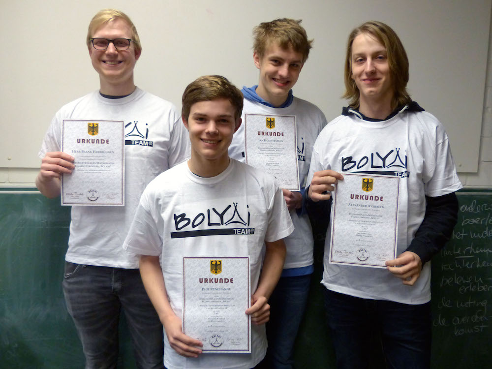 Dieses Jahr hat erstmals ein Schülerteam am internationalen Mathematik-Wettbewerb „Bolyai“ teilgenommen. Bei diesem Wettbewerb, der seinen Ursprung in Ungarn hat, liegt der Schwerpunkt darauf, dass Denkaufgaben in konstruktiver Zusammenarbeit gelöst werden. Das Team „LAU“ bestehend aus Alexander Averbeck, Jan Holstermann und Philipp Schange trat in der Altersklasse „12. Klasse“ an und erzielte 176 Punkte. Somit durften sich die drei Schüler über den ersten Platz in der Region „Hessen/Nordrhein-Westfalen“ und einen damit verbundenen ersten Preis freuen. Zum ersten Platz auf Bundesebene fehlten allerdings zwei Punkte, sodass man sich knapp nicht für das internationale Finale in Budapest qualifizieren konnte.