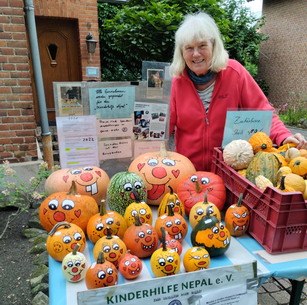 Auch in diesem Jahr wieder ein äußerst erfolgreicher Kürbisverkauf von Resi und Reinhard Schnucklake. Viele Jahre haben sie sich mit ihrem Kürbisverkauf für die Kinderhilfe Nepal stark gemacht. Jetzt hat der Verkauf leider ein Ende, denn ihr Garten an der Ems fällt wegen der Renaturierung der Ems weg. Ein riesiges Dankeschön für den jahrelangen großartigen Kürbisverkauf. Danke auch an alle großzügigen Kürbiskäufer, die die Aktion mit ihren Käufen unterstützt haben. Monika Lucht bedankt sich im Namen der Kinderhilfe Nepal für die diesjährige stolze Summe von € 1.800,-.