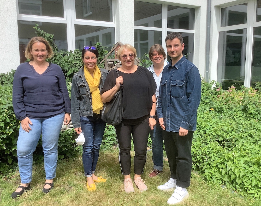 Renata Gargas Altrock (3. v. l.) und Georgios Paroglou (r.) informierten am Mariengymnasium über die Geschichte der Städte Oswiecim (Auschwitz) und Krakau. Das Foto zeigt sie zusammen mit den Lehrerinnen Sandra Benteler, Antonia Vellmanns und Dr. Stephanie Taube (v. links).